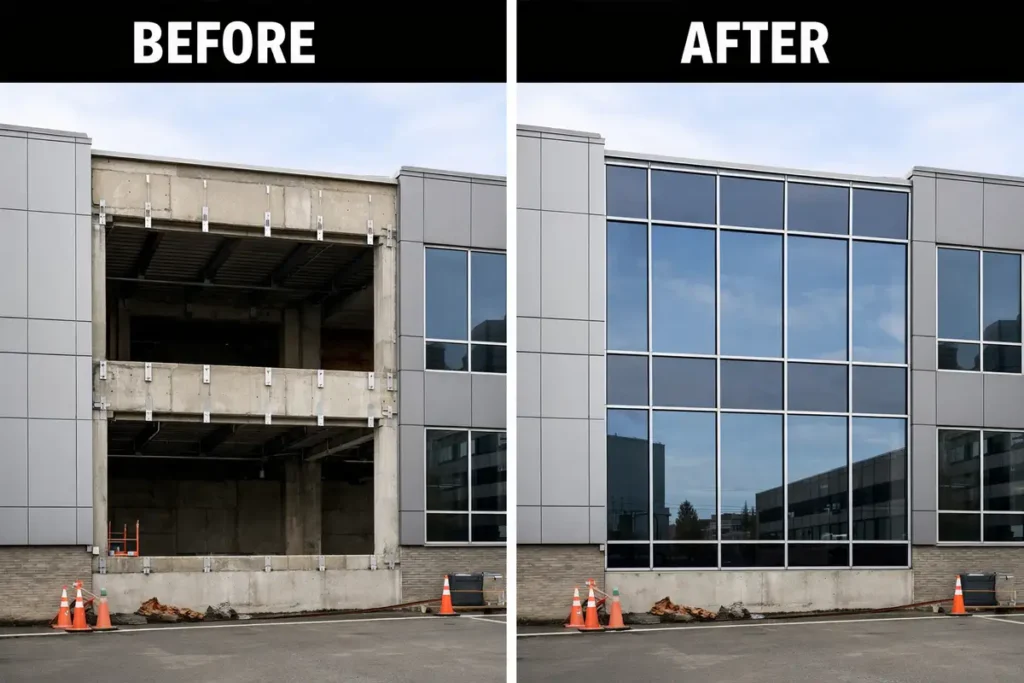 while the after image highlights a clean, fully installed curtain wall system with aligned mullions and reflective glass panels. The transformation appears precise and realistic, demonstrating a completed installation that integrates seamlessly with the existing structure without altering the surrounding environment.
