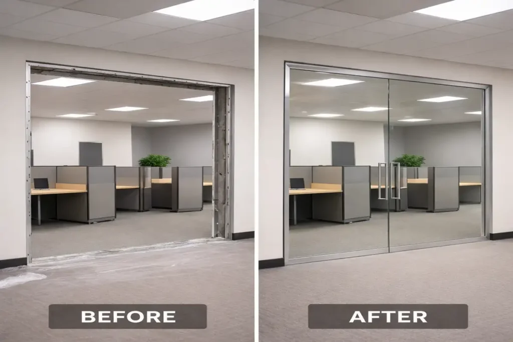 while the after image highlights the completed double-pane glass doors, cleanly installed and properly aligned within the existing frame. The surrounding office environment remains unchanged, clearly demonstrating a realistic and professional installation outcome suitable for service documentation and customer proof.