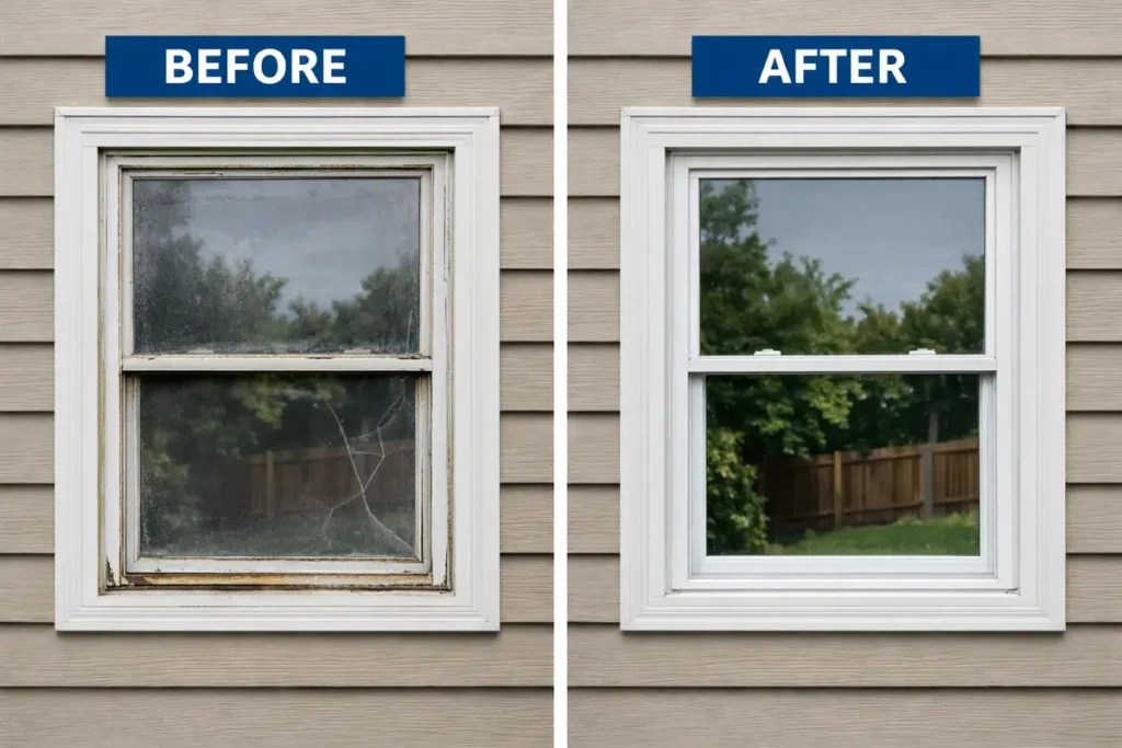 This before-and-after image highlights the impact of professional retrofit window services. The before side shows an older, deteriorated window with rust buildup, cracked glass, worn seals, and visible aging that can lead to drafts and energy loss.